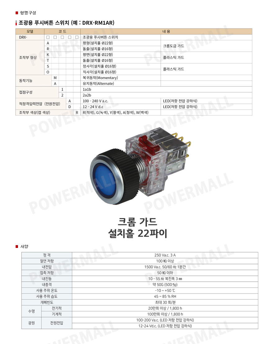 • 한영넉스 DRX-AM1AR 빨강색 22파이 복귀동작 AC100~240V 조광용 푸시버튼 제어용 스위치