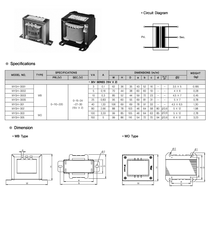 • 운영 WYSH-3002 5VA IN:0-110-220V OUT:0-15-24-27-30V(15V*2) 단상복권 WB 납땜구조형 트랜스