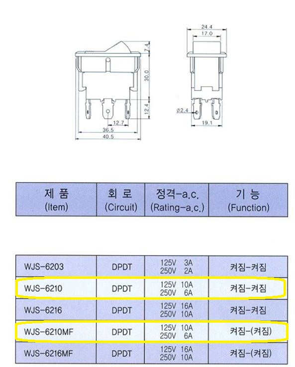 • 우진전기 시소스위치 2단6핀 WJS-6210MF(켜짐<--(켜짐))